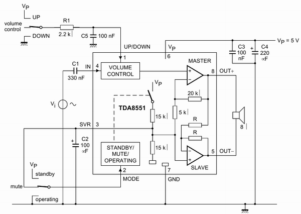 The TDA8581(T) from Philips Semiconductors is a 1-watt Bridge Tied Load (BTL) audio power amplifier capable of delivering 1 watt output power into an 8W load at THD (total harmonic distortion) of 10% and using a 5V power supply. The schematic shown here combines the functional diagram of the TDA8551 with its typical application circuit. The gain of the amplifier can be set by the digital volume control input. At the highest volume setting, the gain is 20 dB. Using the MODE pin the device can be switched to one of three modes: standby (MODE level between Vp and Vp–0.5 V), muted (MODE level between 1 V and Vp–1.4 V) or normal (MODE level less than 0.5 V). The TDA8551 is protected by an internal thermal shutdown protection mechanism.