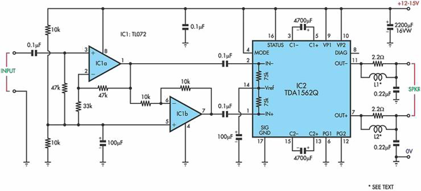 At the heart of the circuit is the TDA1562Q IC, described by Philips as a "monolithic integrated Bridge-Tied Load (BTL) class-H high-efficiency power amplifier". It comes in a 17-pin "DIL-bent-SIL" plastic package and is not only designed for use in car audio and portable PA work but for mains applications as well; eg, mini/midi audio components and TV sound.