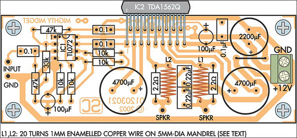As can be seen from the photos and the circuit diagram, the Mighty Midget uses just a handful of parts. It's built on a PC board that measures just 104mm x 39mm but while its size may be modest, these's nothing at all modest about its power output. And the noise and distortion figures are pretty good too.