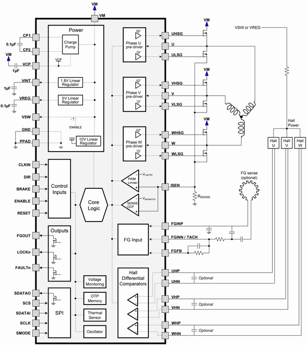 The three-phase brushless motor pre-driver DRV8308 can drive brushless DC and brushless AC (BLAC) - often referred to as permanent magnet synchronous (PMSM). Aimed at 12V and 24V motors, this configurable pre-driver features an integrated digital speed loop with advanced commutation timing and control.